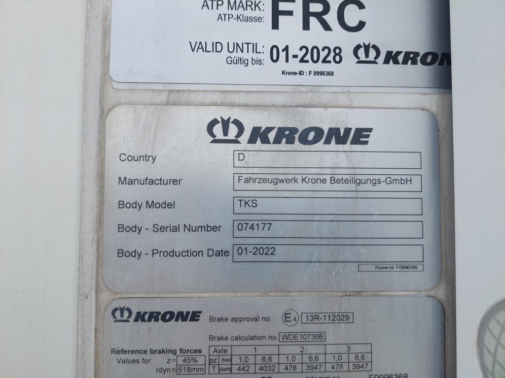 Ausstattung:Agregát Thermo King SLXi 300, platnost ATP do 1/2028, diesel/elektro, celkové hodiny 4860 mth, celkové hodiny motoru 4802 h, 2 x držák rezervy, nápravy Krone, box na palety, zámek zadních vrat, skříňka na nářadí
