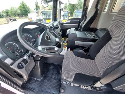 Fahrehausinnen: Nahverkerfahrerhaus, Klimaautomatik, Anzahl der Sitze: 2, mechanische Schiebedach, elektrische Fensterheber, elektrisch betriebene Außenspiegel mit Heizung, Zentralverriegelung, Kühlschrank, Radio, digitalen Fahrtenschreiber, komfort Fahrersitz mit Heizung Außen: Sonnenblende, Nebelscheinwerfer, Warnleuchten: 2 x, Farbe: weiß