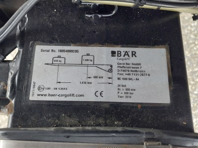 Ausstattung: Hlídač jízdních pruhů, hydraulické čelo BÄR Cargolift BC 1500 S4L-A4, nosnost čela 1500 kg, skříňka na nářadí, zadní náprava pneumatiky Samson