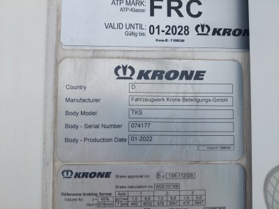 Ausstattung: Agregát Thermo King SLXi 300, platnost ATP do 1/2028, diesel/elektro, celkové hodiny 4860 mth, celkové hodiny motoru 4802 h, 2 x držák rezervy, nápravy Krone, box na palety, zámek zadních vrat, skříňka na nářadí