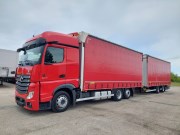 Equipment:Tandemový přívěs, třístranná shrnovací konstrukce, přizvedávání střechy, průjezdná souprava, přední a zadní vrata, nápravy BPW, 2 x skříňka na nářadí, sud na vodu, 2 x držák rezerv, ložná délka k přednímu sklápěcímu čelu 8.060 mm, průměr oka oje 50 mm