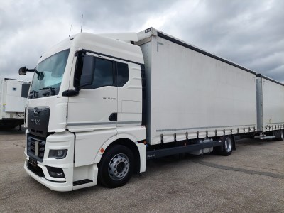 Vozidlo v prodeji s přívěsem č. 25155 - GNIOTPOL G-4080, 30.06.2022, ABS, třístranná shrnovací konstrukce, přizvedávání střechy, celková hmotnost: 11 000 kg, nosnost: 7 200 kg. Rozměry ložné plochy (D x Š x V): 7710 x 2480 x 3000 mm.