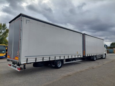 Vozidlo v prodeji s přívěsem č. 25172 - GNIOTPOL G-4080, 28. 10. 2021, ABS, třístranná shrnovací konstrukce, přizvedávání střechy, celková hmotnost: 11 000 kg, nosnost: 7 200 kg. Rozměry ložné plochy (D x Š x V): 7700 x 2480 x 3000 mm.