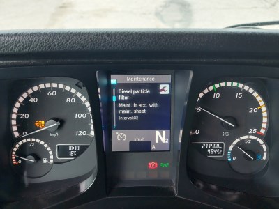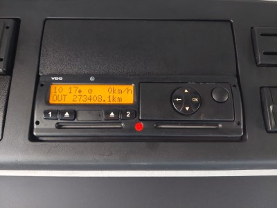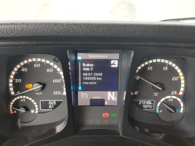 Nefunkční ECAS (elektronicky řízené vzduchové odpružení), neplatné ověření tachografu, provozní oděrky, ranka na čelním skle, poškozené levé schůdky
