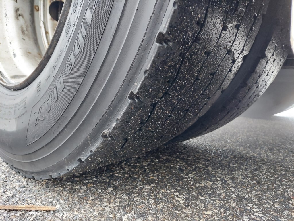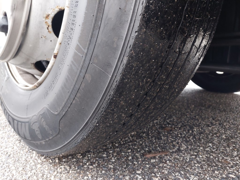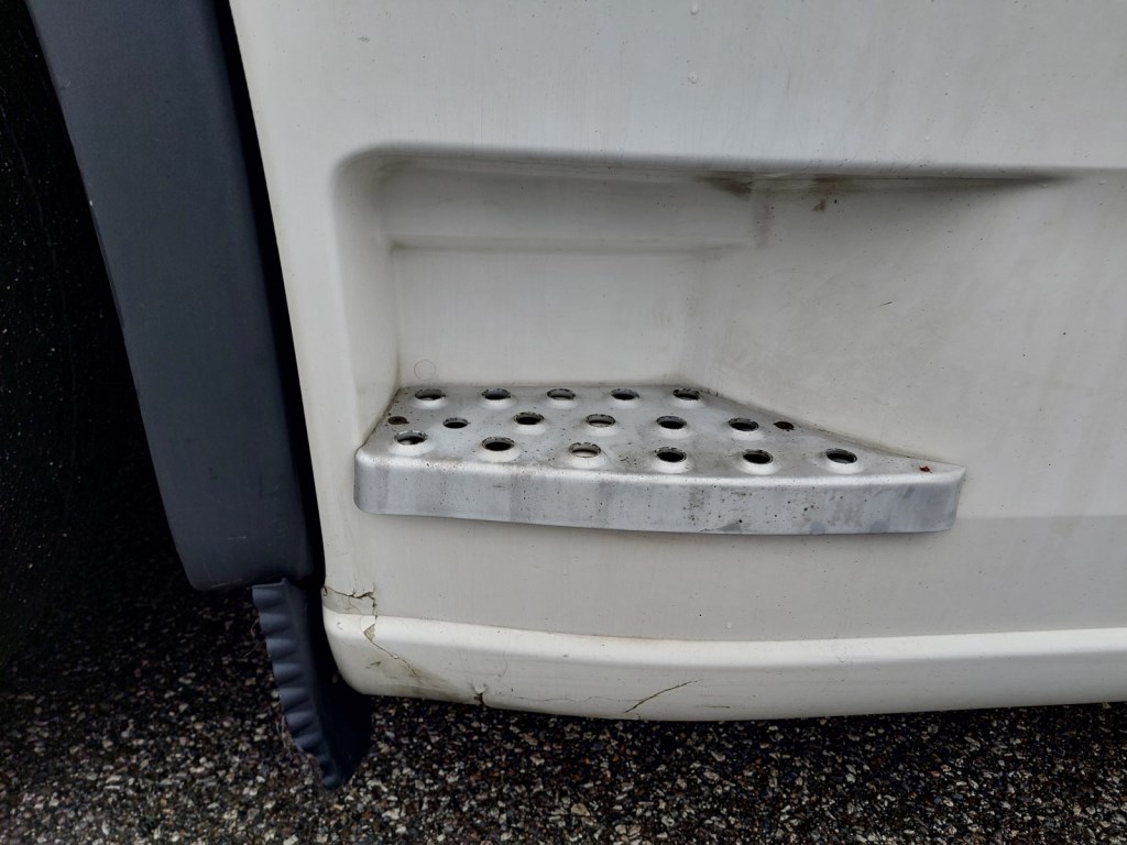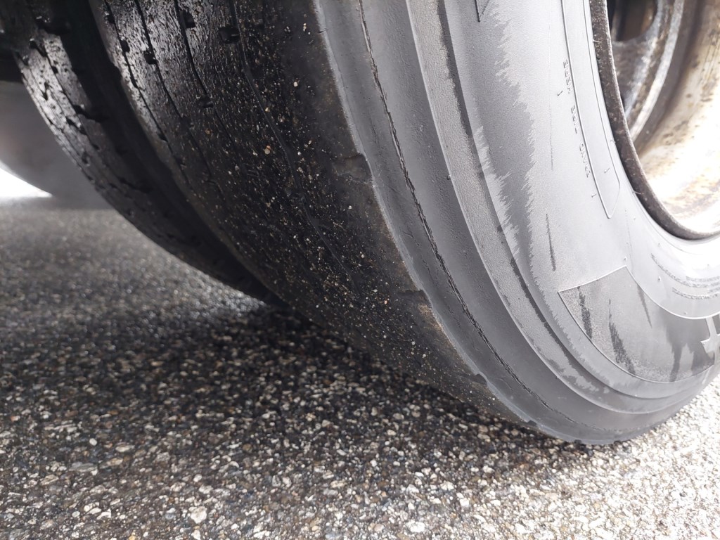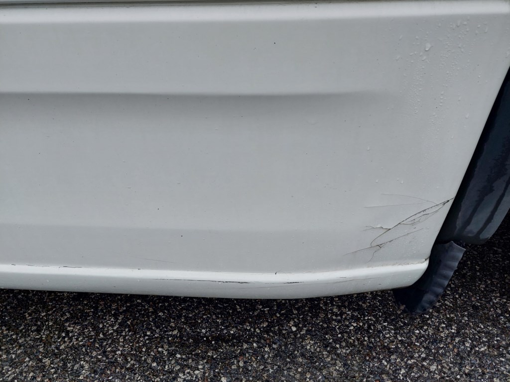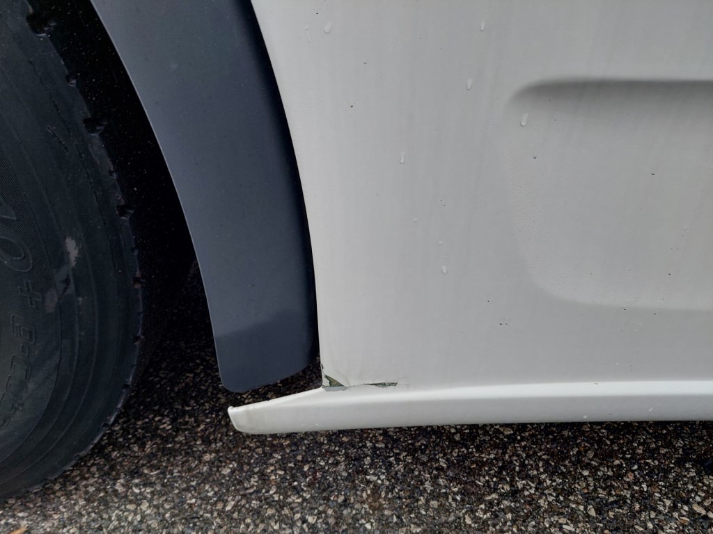 Hlídač jízdních pruhů, odřené kryty zrcátek, prasklé mezinápravové spoilery, poškozená horní část zadních blatníků, provozní oděrky